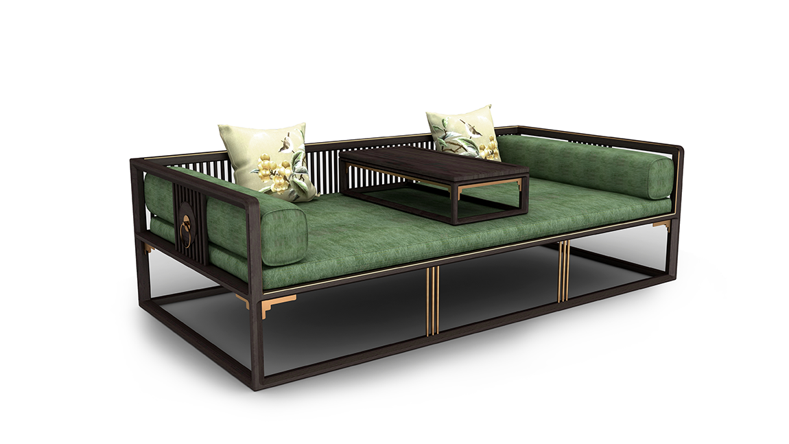 设计说明:这款产品源自于设计师对山间类景的向往以及内心与世无争的情怀。材质为北美胡桃木、装饰配件为纯铜件、桌面上为火烧石材质、沙发上布艺可拆卸。